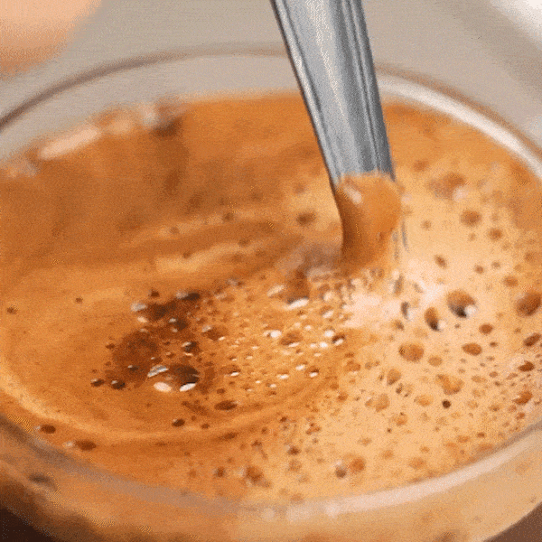 Mit einem Löffel umrühren, bis das Getränk schön cremig und gleichmäßig ist.