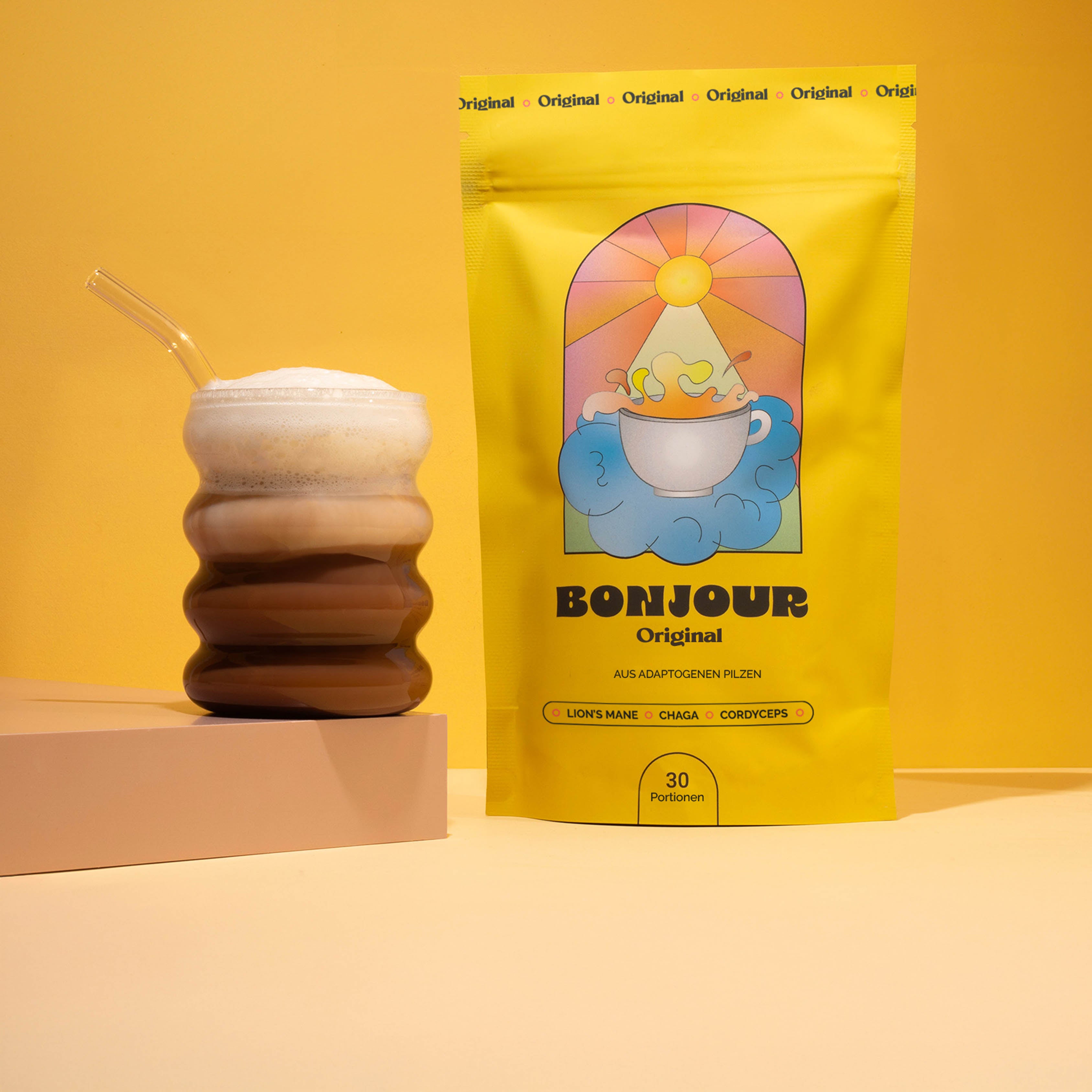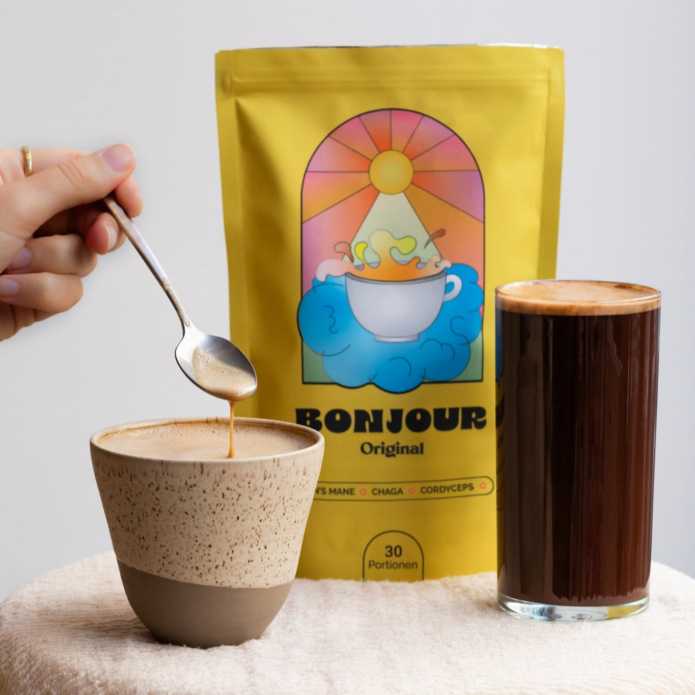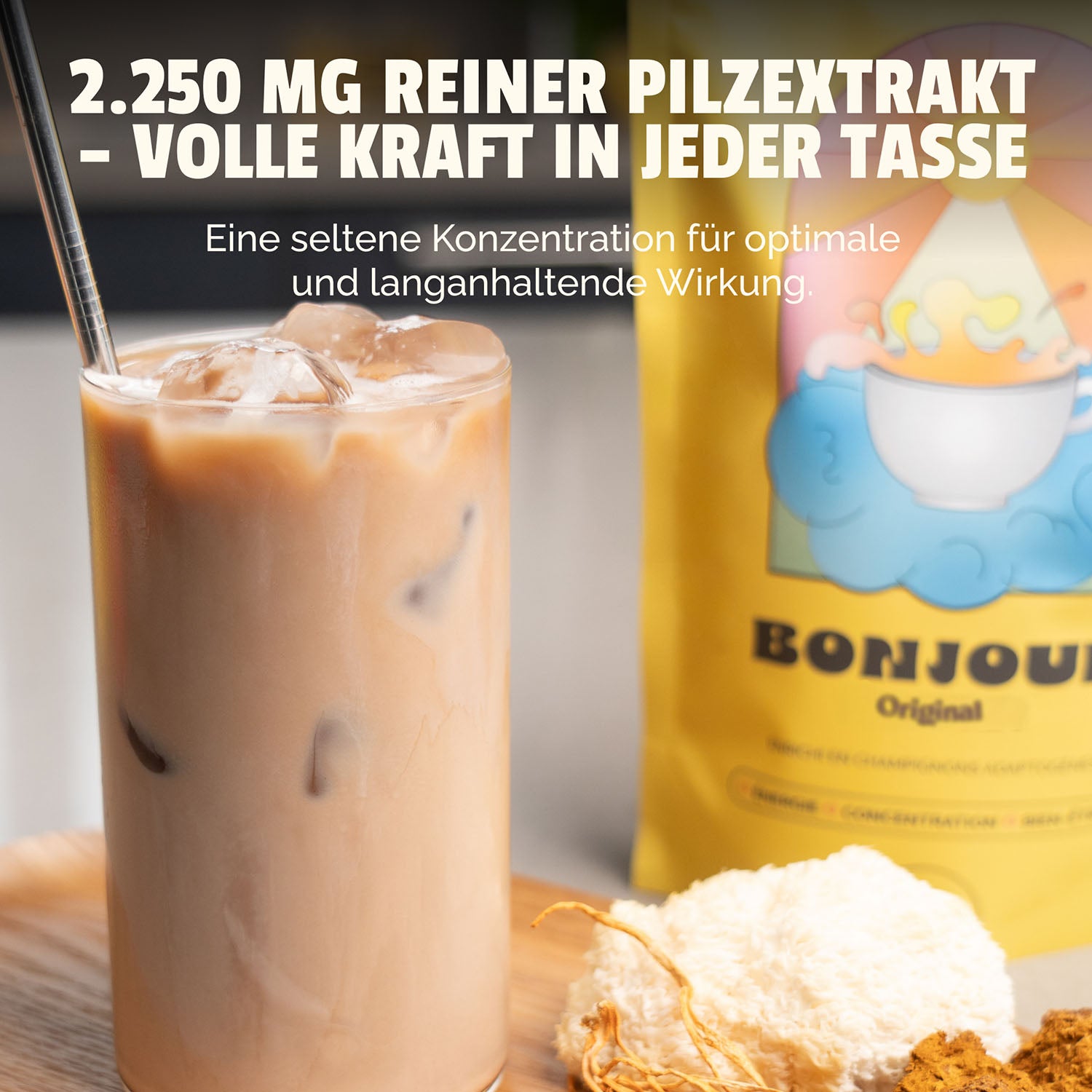 Die besondere Stärke von Bonjour liegt in seinem seltenen, kraftvollen Gehalt: 2.200 mg Bio-Adaptogen-Pilzextrakte pro Tasse – der Schlüssel zu schnellen und tiefgreifenden Effekten.