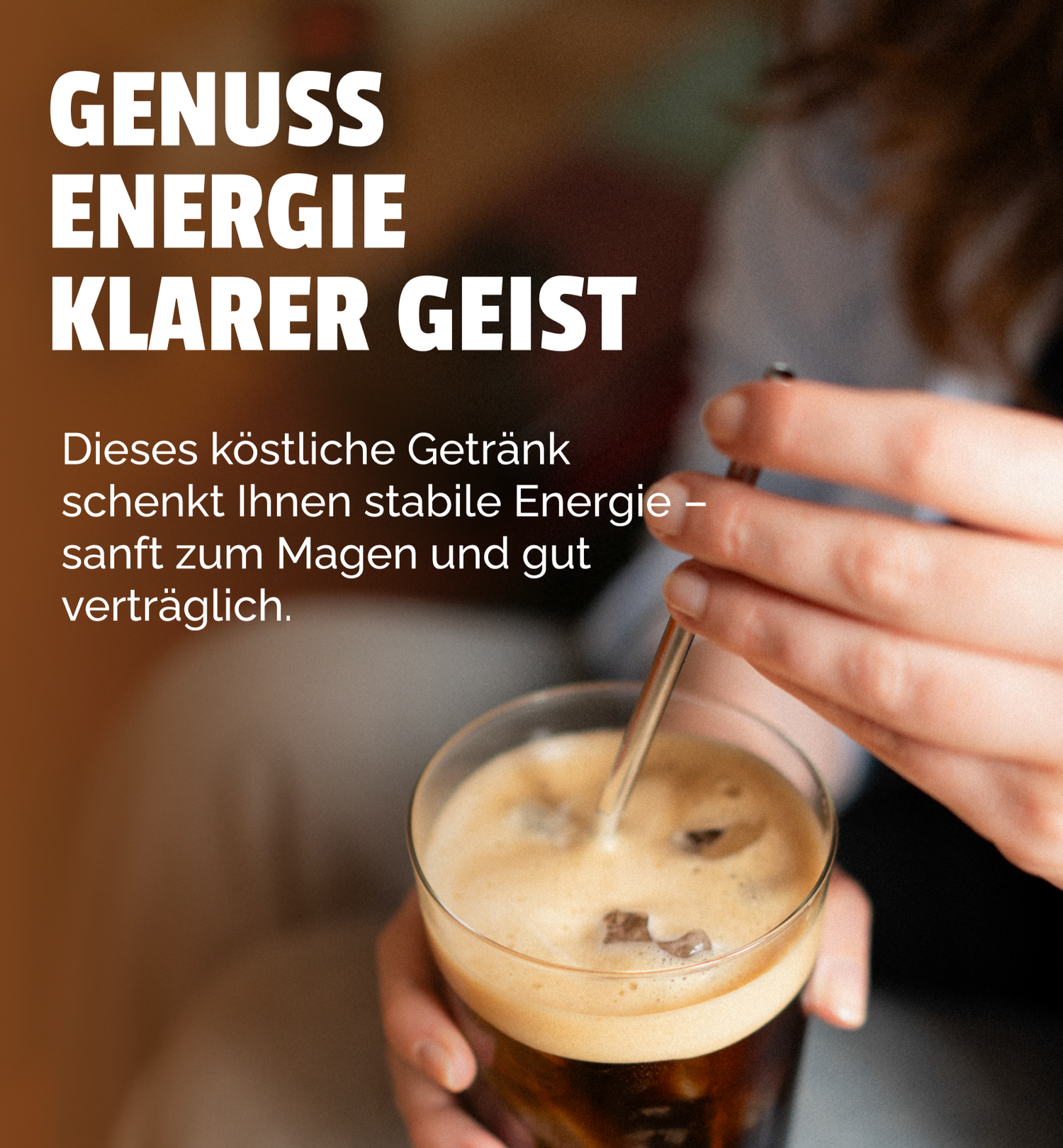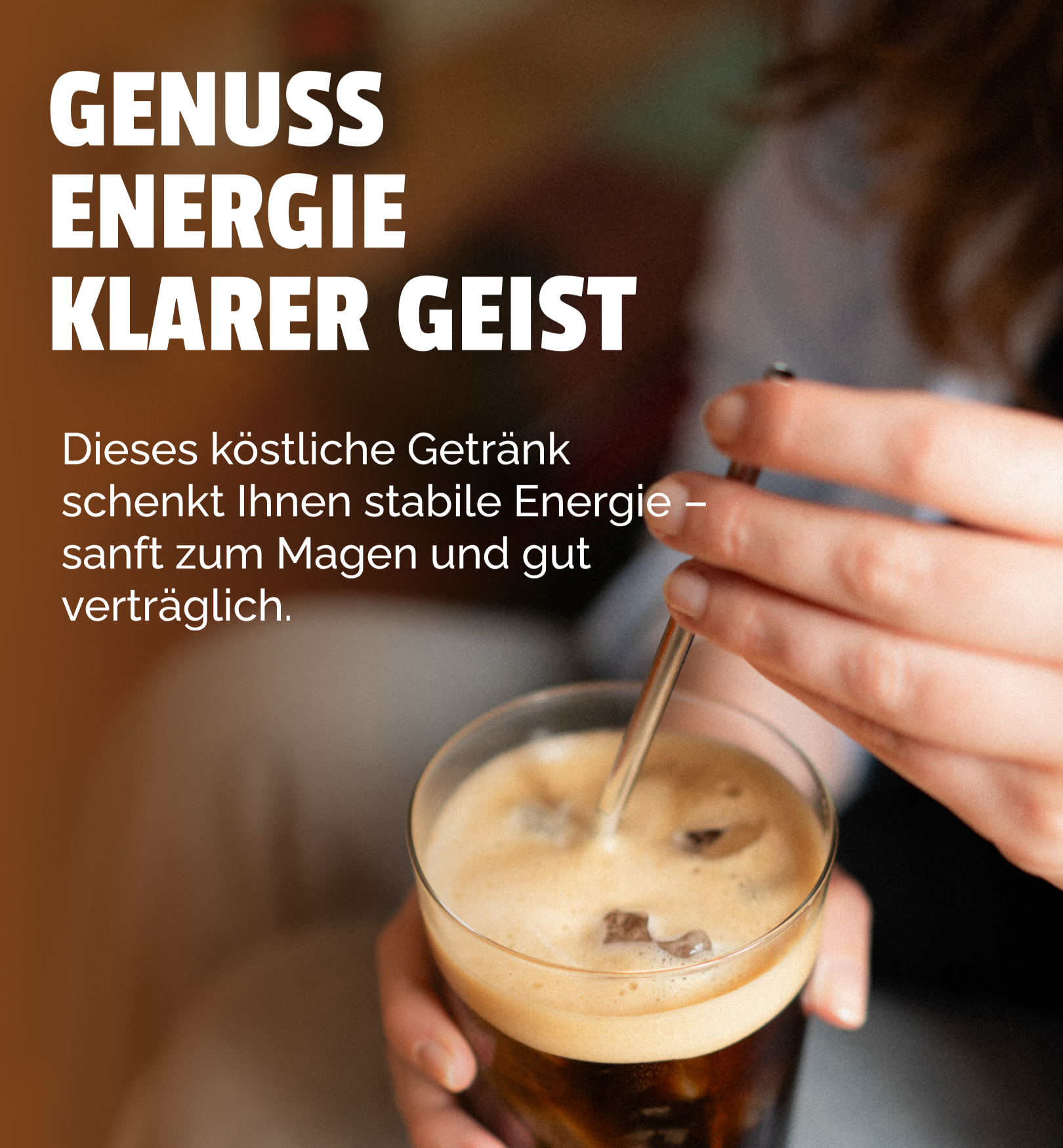Unsere Rezeptur liefert stabile Energie und mentale Klarheit, ganz ohne die typischen Nebenwirkungen von herkömmlichem Kaffee: keine Bauchschmerzen, keine Nervosität, kein Herzklopfen, keine Verfärbung der Zähne und kein Energietief.