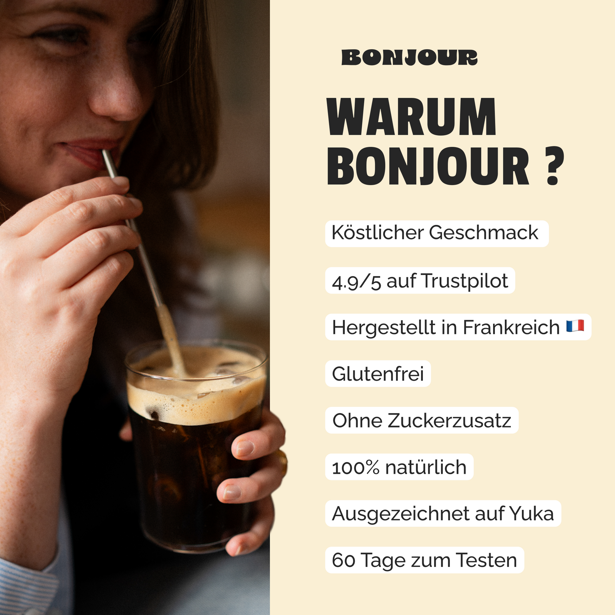Bonjour bietet drei köstliche Sorten, die für stabile Energie und mentale Klarheit sorgen – ganz ohne die typischen Begleiterscheinungen von Kaffee wie Energietiefs, Magenbeschwerden oder Nervosität.