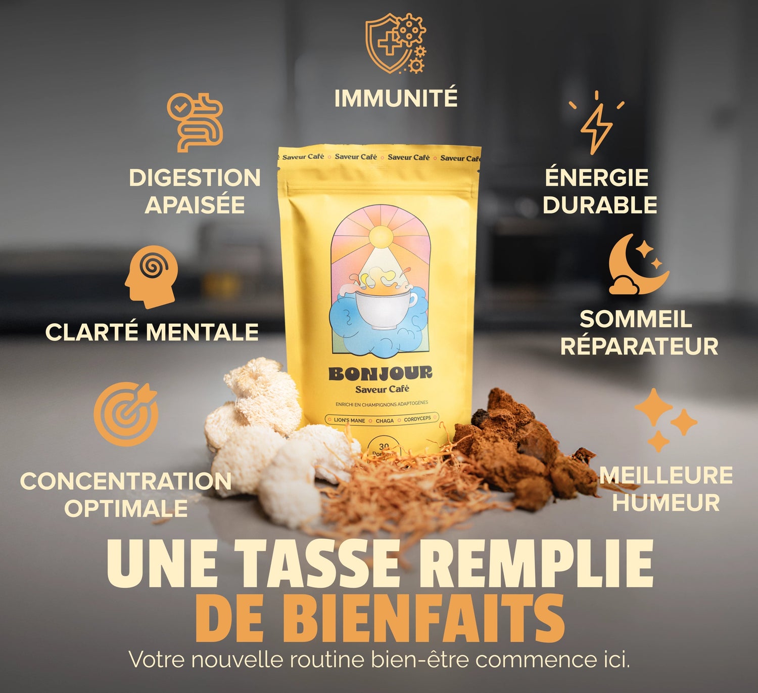 Grâce à une concentration idéale en extraits de plantes et champignons biologiques français— plus de 2250mg d’extraits biologiques par tasse, soit 40 % de la composition — Bonjour offre des bienfaits durables et visibles rapidement, dès les toutes premières tasses :