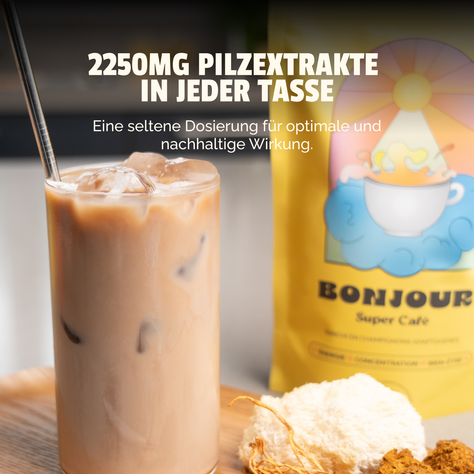 Zutaten: Gerstenröstextrakt (Hordeum vulgare), Arabica-Kaffeebohnenextrakt (Coffea arabica L.), Gerstenmalzextrakt (Hordeum vulgare), Lion's Mane-Extrakt (Hericium erinaceus), Chaga-Extrakt (Inonotus obliquus), Cordyceps-Myzel-Extrakt (Cordyceps sinensis), Roggenröstextrakt (Secale cereale), Natürlicher Koffein-Extrakt.